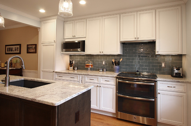 Here is an example of white kitchen with grey glass subway