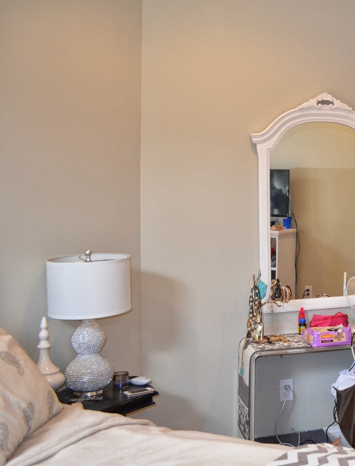Built In Make Up Vanity with Blue and Grey Ikat Chair