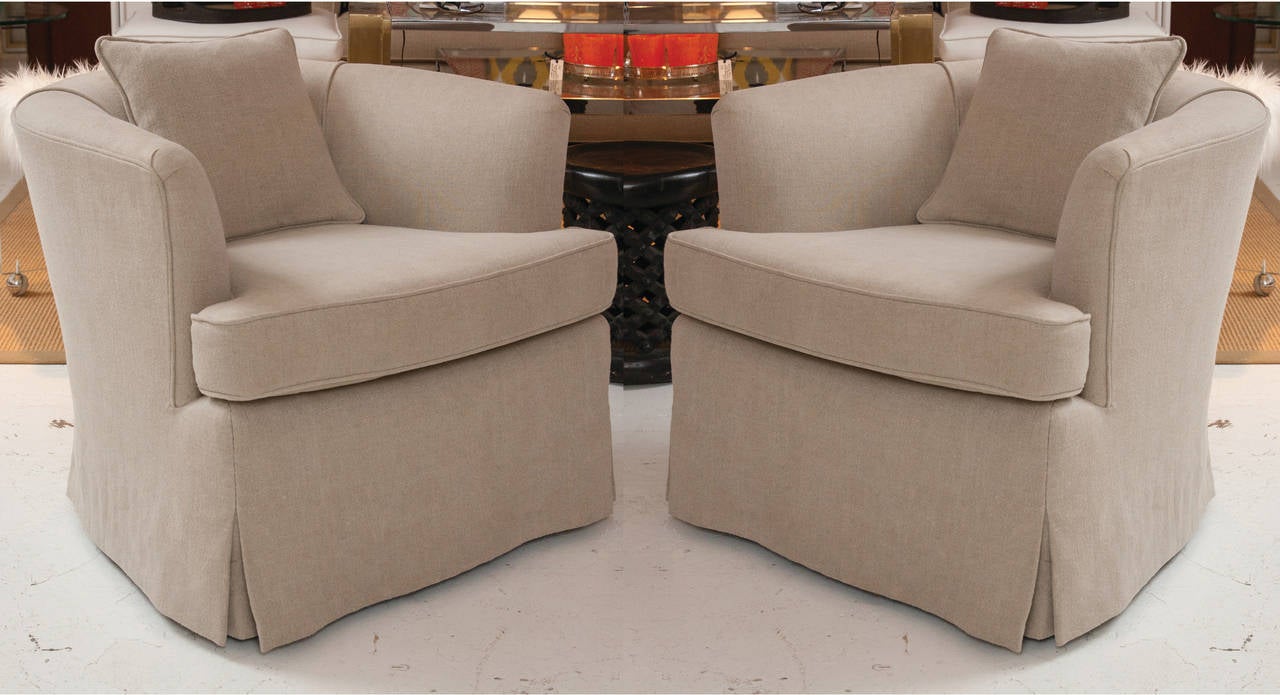 Pair of Custom Linen Mid-Century Swivel Club Chairs at 1stdibs