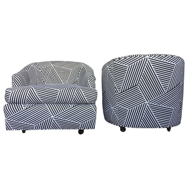 Vintage Black & White Geometric Striped Swivel Club Chairs