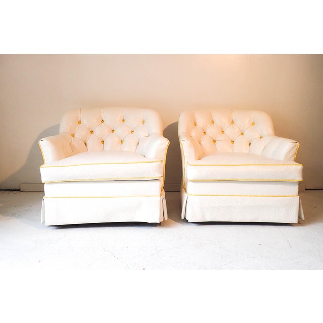 Hollywood Regency White/Yellow Tufted Swivel Club Chairs